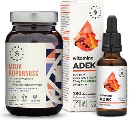 Zestaw ODPORNOŚĆ Aura HerbalsWitamina ADEK w kroplach + Moja Odporność Naturalny Kompleks w kapsułkachKupując w zestawie oszczędzasz: 17,90 zł.Pojedyncze produkty poza zestawem kupisz za: 88,80 zł.Witamina „ADEK” A + D3 (2000IU) + E + K2MK7 krople (30ml)Witamina ADEK to kompleks witamin A, D, E i K na bazie oliwy z oliwek, co zapewnia prawidłowe wchłanianie bez spożywania dodatkowych tłuszczów.Witamina A utrzymuje prawidłowy stan skóry i błon śluzowych, wspiera funkcjonowanie układu odpornościowego, pomaga w utrzymaniu prawidłowego widzenia.Witamina D wspiera prawidłowe funkcjonowanie układu odpornościowego, pomaga w utrzymaniu zdrowych zębów, wspiera prawidłowe funkcjonowanie mięśni, korzystnie wpływa na wchłanianie wapnia i fosforu.Witamina E chroni komórki organizmu przed uszkodzeniem oksydacyjnym.Witamina K pomaga w utrzymaniu zdrowych kości, przyczynia się do prawidłowego krzepnięcia krwi. Zalecane dzienne spożycieZalecana porcja do spożycia w ciągu dnia: 5 kropli.Nie przekraczaj zalecanej dziennej porcji do spożycia.Składniki w dziennej porcjiSkładniki aktywne 5 kropli RWS*Witamina A 800 µg 100%Witamina D 2000 IU (50 µg) 1000%Witamina E 12 mg 100%Witamina K 75 µg 100%*Referencyjna Wartość SpożyciaSposób użyciaPrzed użyciem mocno wstrząsnąć. 5 kropli dodać do wody, soku lub innego chłodnego płynu.Dodatkowe informacjeNie stosować u osób uczulonych na jakikolwiek składnik suplementu.Suplement diety nie może być stosowany jako substytut zróżnicowanej diety. Pamiętaj, że bardzo ważny i zalecany jest zrównoważony sposób żywienia i zdrowy tryb życia.Przed zastosowaniem wskazane jest wykonanie badania 25-(OH)D we krwi oraz konsultacja wyniku z lekarzem lub farmaceutą.Produkt nie powinien być stosowany przez osoby przyjmujące środki przeciwzakrzepowe zawierające antagonistów witaminy K (np. warfaryna i acenokumarol).Możliwość występowania osadu – świadectwo obecności naturalnych składników, nie stanowi wady produktu.SkładnikiOliwa z oliwek, d-alfa-tokoferol (witamina E ze słonecznika), menachinon (witamina K z natto), palmitynian retinylu (witamina A), cholekalcyferol (witamina D z lanoliny), przeciwutleniacz: ekstrakt z rozmarynu.Ilość netto30ml (900 kropli).Moja Odporność – Naturalny Kompleks (60 kapsułek)Moja odporność to naturalny kompleks ekstraktów roślinnych wspierających układ immunologiczny oraz witalność.Imbir wspiera układ odpornościowy organizmu oraz przyczynia się do poprawy witalności. Jeżówka purpurowa pomaga w funkcjonowaniu naturalnego systemu obronnego. Rokitnik wspiera układ immunologiczny. Czosnek przyczynia się natomiast do prawidłowego funkcjonowania układu odpornościowego i pomaga utrzymać zdrowe funkcjonowanie układu oddechowego.Sposób użycia1 kapsułkę popić wodą. Stosować dwa razy dziennie.Zalecane dzienne spożycieZalecana porcja do spożycia w ciągu dnia: 2 kapsułki.Nie przekraczaj zalecanej porcji do spożycia w ciągu dnia.Składniki w dziennej porcjiSkładniki aktywne 2 kapsułkiEkstrakt z jeżówki purpurowej 315 mgEkstrakt z imbiru lekarskiego stand. na 5% gingeroli 262 mgEkstrakt z czosnku stand. na 2% alliny 210 mgEkstrakt z rokitnika 210 mgSkładnikiInulina, ekstrakt z korzeni jeżówki purpurowej DER 4:1, ekstrakt z kłącza imbiru lekarskiego standaryzowany na 5% gingeroli DER 10:1, ekstrakt z czosnku standaryzowany na 2% alliny DER 10:1, ekstrakt z owoców rokitnika DER 4:1, L-leucyna, otoczka kapsułki: Hydroksypropylometyloceluloza.Ilość netto52 g (60 szt. wegańskich kapsułek)Ważne informacjeSuplement diety nie może być stosowany jako substytut zróżnicowanej diety. Pamiętaj, że bardzo ważny i zalecany jest zrównoważony sposób żywienia i zdrowy tryb życia. Suplement diety przechowuj w miejscu niedostępnym dla małych dzieci. Przechowuj suchym miejscu w temperaturze 15-25°C. Nie zamrażaj. Nie stosować u osób uczulonych na jakikolwiek składnik preparatu.