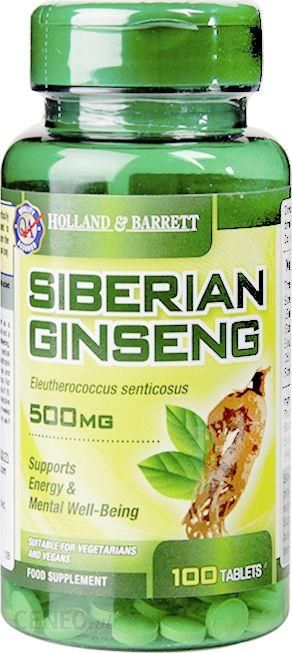 Żeń-szeń Syberyjski 500mg – 100 tablets Holland & Barrett Holland & Barrett Żeń-szeń Syberyjski 500 mg to suplement diety polecany osobom skarżącym się na spadek energii, odporności oraz koncentracji. Zawarte w korzeniu Żeń-szenia Syberyjskiego eleuterozydy pobudzają ośrodkowy układ nerwowy, podnoszą wydolność fizyczną i psychiczną, zwiększają również zdolności adaptacyjne organizmu. Przy regularnej suplementacji odnotowywany jest także wzrost sprawności intelektualnej, odporność organizmu na stres oraz poprawa pamięci. Żeń-szeń syberyjski poprawia też w znaczących sposób ogólne samopoczucie, podnosi libido i wspomaga oczyszczanie organizmu z toksyn. Składniki: Środki wypełniające (fosforan dwuwapniowy, celuloza mikrokrystaliczna), wyciąg z żeń-szenia syberyjskiego, środki przeciwzbrylające (stearynian magnezu, dwutlenek krzemu). Stosowanie: Jedna tabletka trzy razy na dobę, najlepiej z posiłkami. Nie przekraczać zalecanej dziennej porcji do spożycia. Dodatkowe informacje: Bez sztucznych barwników, aromatów i substancji słodzących. Bez konserwantów. Bez dodatku cukru lub soli. Bez skrobi, bez kukurydzy, bez mleka, bez laktozy, bez soi, bez glutenu, bez pszenicy, bez drożdży. Wskazania: Odpowiedni dla wegan, wegetarian i pescowegetarian. Informacja o wartościach odżywczych: Trzy tabletki zawierają: Żeń-szeń syberyjski 1500 mg (Eleutherococcus senticosus) (korzeń) (standaryzowany do zawartości 0,8% eleuterozydów) (z 60 mg ekstraktu o stężeniu 25:1)