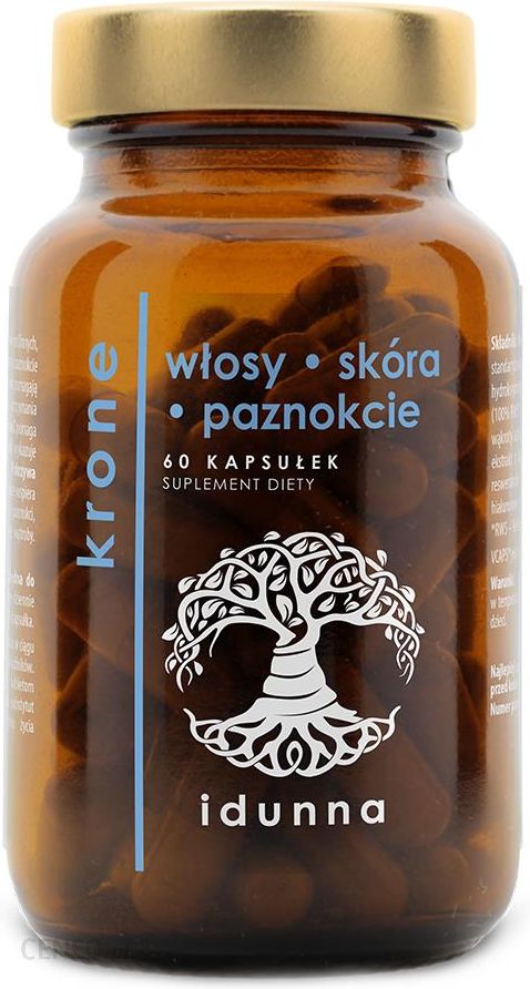 SUPLEMENT DIETYIDUNNA KroneWłosy – Skóra – Paznokcie60 kapsułek wegetariańskichBez sztucznych substancji wypełniających, przeciwzbrylających, barwnikówSkładniki produktu pomagają w zachowaniu zdrowych, silnych włosówProdukt pomaga w zachowaniu zdrowej skórySkładniki suplementu pomagają w zachowaniu zdrowych paznokciKrone to luksusowa seria dla kobiety wyjątkowej, która chce szczególnie zadbać o swoją cerę, włosy i paznokcie. Odkryj zbawienną moc naturalnych ekstraktów roślinnych i zadbaj kompleksowo o swoje zdrowie i urodę z pokrzywą, wąkrotą azjatycką i skrzypem polnym. Niczym korona na głowie królowej Krone sprawi, że staniesz się pewna siebie i świadoma swoich kobiecych zalet.Suplement diety Krone to kompleks starannie wyselekcjonowanych ekstraktów roślinnych oraz cennych minerałów, które wspomagają zdrowie i pomagają dbać o urodę. Znaleźć można tu między innymi ekstrakt ze skrzypu polnego, który znany jest ze swojego cennego wpływu na kondycję włosów, paznokci i skóry, a także ekstrakt z pokrzywy, cenionej ze względu na właściwości wspomagające zachowanie elastyczności ścięgien, stawów i mięśni oraz działanie wspierające witalność organizmu.Wyciąg z gotu kola, czyli wąkroty azjatyckiej, wspiera natomiast procesy samo naprawcze organizmu, dzięki czemu pozytywnie wpływa na stan skóry, spowalniając procesy starzenia. Krone to także cenne antyoksydanty, takie jak cynk i selen, które biorą udział w ochronie komórek przed stresem oksydacyjnym i pozytywnie wpływają na stan włosów, skóry i paznokci. Dzięki zawartości biotyny natomiast suplement ten wspomaga utrzymanie prawidłowego metabolizmu makroskładników odżywczych oraz budowę keratyny.Poczuj się jak prawdziwa królowa piękności i zapomnij o oznakach starzenia. Krone podkreśla naturalne piękno i atuty każdej bogini. To wyjątkowa seria, z którą poczujesz się nie tylko perfekcyjnie zadbana, ale i pełna energii oraz pewności siebie.________________________________________________________________________________________________________Składniki w porcji dziennej (1 kapsułka)Ekstrakt z ziela skrzypu polnego (Equisetum arvense) 150 mgWitamina C 80 mg (100%*)Ekstrakt z liści pokrzywy zwyczajnej (Urtica dioica) 50 mgEkstrakt 4:1 z ziela wąkroty azjatyckiej (Centella asiatica) 50 mgEkstrakt z korzenia rdestu japońskiego(Polygonum cuspidatum) 25 mg- w tym resweratrol 12,5 mgKwas hialuronowy 10 mgCynk 10 mg (100%*)Selen 55 µg (100%*)Biotyna 50 µg (100%*)*RWS – Referencyjne Wartości Spożycia________________________________________________________________________________________________________Składniki: Ekstrakt z ziela skrzypu polnego standaryzowany na 7% krzemionki, kapsułka celulozowa VCAPS®: hydroksypropylometyloceluloza, witamina C (kwas L-askorbinowy, ekstrakt z lisci pokrzywy zwyczajnej, ekstrakt 4:1 z ziela wakroty azjatyckiej 50,00 mg, cynk (cytrynian cynku), ekstrakt z korzenia rdestu japonskiego standaryzowany na 50% resweratrolu, selen (l-selenometionina), kwas hialuronowy, biotyna (d-biotyna).Produkt nie zawiera sztucznych substancji wypełniających, przeciwzbrylających, barwników.Masa netto: 33 gSposób użycia: Zalecana porcja produktu do spożycia w ciągu dnia niezbędna do uzyskania korzystnego działania produktu: Spożywać rano 1 kapsułkę dziennie. Popić wodą (250 ml). Zalecana porcja dzienna to 1 kapsułka.Warunki przechowywania: Chronić przed światłem. Przechowywać w temperaturze pokojowej, w suchym miejscu, w sposób niedostępny dla małych dzieci.Środki ostrożności: Nie należy przekraczać zalecanej porcji do spożycia w ciągu dnia. Nie stosować w przypadku uczulenia na którykolwiek ze składników. Produkt dla dorosłych. Spożywania produktu nie zaleca się kobietom w ciąży i karmiącym piersią. Produkt nie może być stosowany jako substytut zróżnicowanej diety. Ważne jest prowadzenie zdrowego trybu życia i zrównoważonego sposobu żywienia.Opakowanie: szklany słoiczek, 60 kapsułekProducent: IdunnaData ważności: 09/2022