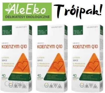 Właściwości:Suplement diety.Koenzym Q10, zwany także Ubichinon, jest naturalnym składnikiem komórek i jego obecność w mitochondriach jest istotna przy wytwarzaniu energii.Składniki:(w przeliczeniu na zalecaną porcję do spożycia w ciągu dnia – 1 kapsułka): koenzym Q10 (ubichinon) 100 mg; inulina; żelatyna (kapsułka).Produkt nie zawiera żadnych sztucznych dodatków takich jak konserwanty, barwniki, aromaty, wypełniacze. Odcień produktu może się różnić ze względu na intensywność koloru naturalnego składnika.Sposób użycia:1 kapsułka raz dziennie.Nie stosować u kobiet w ciąży oraz karmiących piersią.Nie przekraczać zalecanej porcji do spożycia w ciągu dnia.Suplement diety nie może być stosowany jako substytut (zamiennik) zróżnicowanej diety.Dla zdrowia ważne jest stosowanie zbilansowanej i zróżnicowanej diety oraz zdrowego trybu życia.Nie stosować w przypadku uczulenia na którykolwiek ze składników produktu.Opakowanie: 40 kapsułek