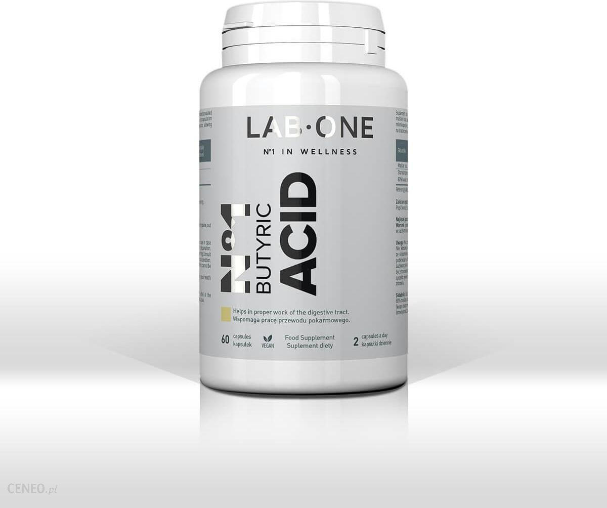 Lab One Butyric Acid – 60kaps. N°1 Butyric ACID zawiera najwyższej jakości mikrokapsułkowany maślan sodu standaryzowany na kwas masłowy w aż 80%. Maślan sodu jest dość szybko metabolizowany w żołądku i w początkowym odcinku jelita cienkiego, dlatego aby suplementacja była skuteczna konieczne jest zastosowanie najnowszych technologii, dzięki którym zawartość kapsułki dotrze w dalszy odcinek przewodu pokarmowego.W N°1 Butyric ACID zastosowano technologię mikrokapsułek, która zabezpiecza substancję biologicznie czynną preparatu, pozwalając na dostarczenie kwasu masłowego do jelita cienkiego i grubego. Dla osłony mikrokapsułkowej użyto kwasu stearynowego, który jest naturalnie występującym kwasem tłuszczowym. Maślan sodu to związek chemiczny, będący głównym źródłem drogocennego kwasu masłowego, który jest podstawowym i kluczowym materiałem energetycznym dla komórek nabłonka przewodu pokarmowego, dlatego preparat w szczególności zalecany jest w celu poprawy stanu jelit i dolegliwościach związanych z pracą przewodu pokarmowego.Opakowanie: 60 kapsułek.Zalecane spożycie: Po jednej kapsułce dwa razy dziennie, rano i wieczorem. Popić wodą. Stosować przez okres minimum 3 miesięcy.Nie należy przekraczać zalecanej dziennej porcji do spożycia w ciągu dnia. Suplementy diety nie mogą być stosowane jako substytut (zamiennik) zróżnicowanej diety. Zrównoważony sposób żywienia i zdrowy tryb życia są ważne dla zachowania dobrego stanu zdrowia. Spożywanie zalecanej dziennej porcji produktu zapewnia korzystny efekt dla zdrowia.Warunki przechowywania: Przechowywać w temperaturze pokojowej, w suchym miejscu, w sposób niedostępny dla dzieci. Produkt odpowiedni dla vegan.Składniki: Zawartość w zalecanej do spożycia dziennej porcji produktu (2 kapsułki) Maślan sodu 500 mg Standaryzowany do min. 80% kwasu masłowego.