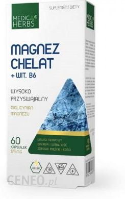 MAGNEZ CHELAT + WIT. B6 60kaps. MEDICA HERBSUkład Nerwowy Energia KościSuplement Dietydiglicynian magnezuSkładnikiW przeliczeniu na zalecaną porcję do spożycia w ciągu dnia – 2 kapsułki:diglicynian magnezu (chelat magnezu) 1750 mg (350 mg magnezu, 94% *RWS);chlorowodorek pirydoksyny (witamina B6) 4,2 mg, 300% *RWS;żelatyna (kapsułka).*RWS – referencyjna wartość spożyciaOpisMagnez wspiera właściwe funkcjonowanie układu nerwowego orazprzyczynia się do zmniejszenia uczucia zmęczenia i znużenia.Wspomaga prawidłowy stan mięśni, kości i zębów.Jest stosowany przy dolegliwościach takich jak drganie powiek czy skurcze mięśniowe.Magnez wspomaga odpowiednią równowagę elektrolitową.Wspólnie z witaminą B6 uczestniczy w utrzymaniu prawidłowego metabolizmu energetycznego.Dodatkowo witamina B6 wspiera odpowiednią produkcję czerwonych krwineki właściwe funkcjonowanie układu odpornościowego.Magnez w formie chelatu cechuje się wysoką przyswajalnością,a witamina B6 ułatwia jego wchłanianie z przewodu pokarmowego.Produkt nie zawiera żadnych sztucznych dodatków takich jak konserwanty,barwniki, aromaty, wypełniacze.Odcień produktu może się różnić ze względu na intensywność koloru naturalnego składnika.Zalecana porcja do spożycia:1 kapsułka 1-2 razy dziennie.PrzechowywaniePrzechowywać w temperaturze pokojowej w suchym miejscu, niedostępnym dla małych dzieci.Chronić przed wilgocią i światłem.Uwagi:Nie stosować u kobiet w ciąży oraz karmiących piersią.Nie przekraczać zalecanej porcji do spożycia w ciągu dnia.Suplement diety nie może być stosowany jako substytut (zamiennik) zróżnicowanej diety.Dla zdrowia ważne jest stosowanie zbilansowanej i zróżnicowanej diety oraz zdrowego trybu życia.Nie stosować w przypadku uczulenia na którykolwiek ze składników produktu.Informacje dodatkoweUWAGA – film / zdjęcie / wizualizacja produktu może odbiegać od aktualnego wyglądu.