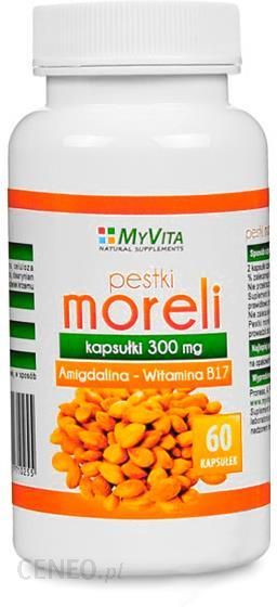MYVITA PESTKI MORELI 300MG 60 KAPS.- Działanie antynowotworowe- Bogate w witaminę B17- Źródło witaminy A, E i mnóstwo magnezu!Pestkom z moreli przypisuje się cudowne wręcz właściwości w leczeniu raka. Skromne pesteczki pastelowego owocu są przedmiotem wielu naukowych debat.Wewnątrz miękkiej części moreli znajduje się nasienie, czyli pestka, zwana przez niektórych morelowym migdałem, lub gorzkim migdałem. Morelowe migdały zwykle pochodzą z Armenii, północnych Chin, w rejonach Himalajów i przylegającej części Azji i uważa się je zadobre źródło żelaza, potasu i fosforu, ale tak na prawdę furorę robią jako najlepsze źródło witaminy B17 znanej również jako amigdalinę. Amigdalinę, choć w mniejszych ilościach znajdziemy także w pestkach śliwek i jabłek.Zalecane dawkowanie2 kapsułki dziennie, popić wodą.Nie przekraczać zalecanej porcji do spożycia w ciągu dnia.Wartości odżywczePorcja 2kapIlość porcji w opakowaniu 30Opakowanie 60kapSKŁADNIKI AKTYWNE Pestki moreliZawartość jednej porcji zaw:Pestki moreli 600 mg