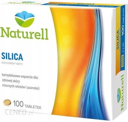 Naturell Silica to suplement diety o wysokiej zawartości witamina i minerałów z dodatkiem aminokwasów i ziół. Zawarta w produkcie biotyna pomaga zachować zdrowe włosy i skórę, pomaga w prawidłowym funkcjonowaniu układu nerwowego, stymulacja możliwości pracy umysłowej, zalecana w okresach przedłużonego zmęczenia i w trakcie rekonwalescencji po załamaniach nerwowych. Cynk pomaga w utrzymaniu prawidłowej równowagi kwasowo-zasadowej, utrzymaniu prawidłowego metabolizmu węglowodanów i utrzymaniu prawidłowych funkcji poznawczych; pomaga w utrzymaniu zdrowych kości, włosów i paznokcie, a także w utrzymaniu prawidłowego poziomu testosteronu we krwi.Skład:Substancje wypełniające: fosforany wapnia (fosforan diwapniowy); celuloza mikrokrystaliczna, żel celulozowy; wyciąg ze skrzypu polnego (Equisetum arvense); L-lizyna; wyciąg z alg (workoliść członowaty, Ascophyllum nodosum); substancja glazurująca: kwasy tłuszczowe (kwas stearynowy); cynk (siarczan cynku); substancja wypełniająca: sól sodowa karboksymetylocelulozy usieciowana; kwas p-aminobenzoesowy (PABA); DL-metionina; krzem (ditlenek krzemu); niacyna (amid kwasu nikotynowego); żelazo (fumaran żelaza (II)); kwas pantotenowy (D-pantotenian wapnia); biotyna (D-biotyna); substancja glazurująca: hydroksypropylometyloceluloza; substancja glazurująca: sole magnezowe kwasów tłuszczowych (stearynian magnezu); barwnik: karmel amoniakalny; witamina B2 (ryboflawina); substancja glazurująca: glikol polietylenowy; selen (selenian (IV) sodu).Może zawierać śladowe ilości skorupiaków, ryb, soi i ich produktów pochodnych.Jedna tabletka zawiera:Witaminy: niacyna 10 mg ekwiwalentu niacyny (62,5%*), kwas pantotenowy 7,5 mg (125%*), ryboflawina (witamina B2) 0,7 mg (50%*), biotyna 80 μg (160%*).Składniki mineralne: cynk 6 mg (60%*), krzem 5 mg, żelazo (II) 3 mg (21,4%*), selen 27,5 μg (50%*).Aminokwasy: L-lizyna 21 mg, DL-metionina 11 mg, kwas p-aminobenzoesowy (PABA) 11 mg.Zioła: wyciąg ze skrzypu polnego 30 mg, wyciąg z alg (workoliść członowaty) 20 mg.Dwie tabletki zawierają:Witaminy: niacyna 20 mg ekwiwalentu niacyny (125%*), kwas pantotenowy 15 mg (250%*), ryboflawina (witamina B2) 1,4 mg (100%*), biotyna 160 μg (320%*).Składniki mineralne: cynk 12 mg (120%*), krzem 10 mg, żelazo (II) 6 mg (42,8%*), selen 55 μg (100%*).Aminokwasy: L-lizyna 42 mg, DL-metionina 22 mg, kwas p-aminobenzoesowy (PABA) 22 mg.Zioła: wyciąg ze skrzypu polnego 60 mg, wyciąg z alg (workoliść członowaty) 40 mg.* procent realizacji referencyjnych wartości spożyciaWłaściwości niektórych składników:Niacyna – przyczynia się do utrzymania prawidłowego metabolizmu energetycznego oraz pomaga w prawidłowym funkcjonowaniu układu nerwowego i funkcji psychologicznych, przyczynia się do zmniejszenia uczucia zmęczenia i znużenia.Biotyna – pomaga zachować zdrowe włosy i skórę, pomaga w prawidłowym funkcjonowaniu układu nerwowego, stymulacja możliwości pracy umysłowej, zalecana w okresach przedłużonego zmęczenia i w trakcie rekonwalescencji po załamaniach nerwowych,Witamina B2 (ryboflawina) – pomaga w prawidłowym funkcjonowaniu układu nerwowego oraz w utrzymaniu prawidłowego stanu czerwonych krwinekCynk – pomaga w utrzymaniu prawidłowej równowagi kwasowo-zasadowej, utrzymaniu prawidłowego metabolizmu węglowodanów i utrzymaniu prawidłowych funkcji poznawczych; pomaga w utrzymaniu zdrowych kości, włosów i paznokcie, a także w utrzymaniu prawidłowego poziomu testosteronu we krwi.Przeciwwskazania:Nadwrażliwość na którykolwiek ze składników preparatu. W okresie ciąży i karmienia piersią przed zastosowaniem należy skonsultować się z lekarzem lub farmaceutą.Zalecane spożycie:Dorośli 1-2 tabletki dziennie po posiłku.Ważne informacje:Nie należy przekraczać zalecanej porcji do spożycia w ciągu dnia. Suplement diety nie może być stosowany jako substytut zróżnicowanej diety ani aktywnego trybu życia. Utrzymanie prawidłowego stanu zdrowia wymaga zrównoważonego i zróżnicowanego odżywiania i prowadzenia zdrowego trybu życia. Istnieje wiele czynników ryzyka choroby. Zmiana jednego z tych czynników ryzyka może wywierać korzystny wpływ lub nie wywierać go. Przechowywać w sposób niedostępny dla małych dzieci w temperaturze pokojowej.Pojemność opakowania:100 tabletekProducent:USP Zdrowie Sp. z o.o,ul. Poleczki 35,02-822 Warszawa.