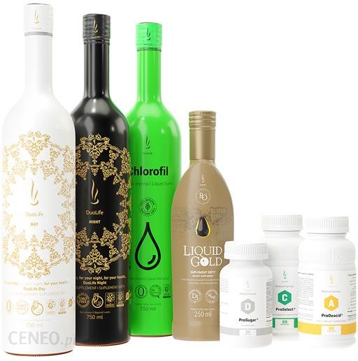 PAKIET DUOLIFE METABOLIZM CUKRÓW Nieprawidłowo przebiegające procesy związane z metabolizmem cukrów, negatywnie wpływają na czynność narządów wewnętrznych, w tym nasz mózg. Ostatnie kilkadziesiąt lat to dowód na to, że zaburzenia metaboliczne osiągnęły poziom problemu epidemiologicznego. Wzrost ich występowania związany jest przede wszystkim z niezdrowym trybem życia i niewłaściwym odżywianiem. Skuteczna walka z zaburzeniami metabolizmu cukrów, polega między innymi na wdrożeniu racjonalnej diety i wspomaganiu właściwie dobranymi preparatami. Rekomendujemy korzystanie z produktów wchodzących w skład pakietu Metabolizm Cukrów. Zawarte w ich składzie substancje dowodzą, że zachowanie prawidłowego poziomu cukru we krwi jest możliwe. Zegar biologiczny METABOLIZM CUKRÓW: 8:00 – 25 ml DuoLife Dzień przed posiłkiem 8:30 – 2 kapsułki ProSugar Medical Formula oraz 20 ml Chlorofil DuoLife 10:00 – 2 kapsułki ProDeacid Medical Formula 14:00 – 5 ml RegenOil Liquid Gold + 2 kapsułki ProSelect Medical Formula 19:00 – 25 ml DuoLife Noc przed posiłkiem Pakiet zawiera: 1szt – ProSugar (60 kapsułek), 1szt – ProSelect (60 kapsułek), 1szt – ProDeacid (60 kapsułek), 1szt – Chlorofil (750 ml), 1szt – DuoLife Dzień i Noc (Dzień 750 ml + Noc 750 ml), 1szt – RegenOil LiquidGold (250 ml) Produkt należy zastosować przed spożyciem ostatniego posiłku.Godzina podana orientacyjnie. Rekomendowany czas suplementacji: 3 miesiące Jeden pakiet przy regularnym stosowaniu wystarcza na około 1 miesiąc, dla jednej osoby dorosłej.