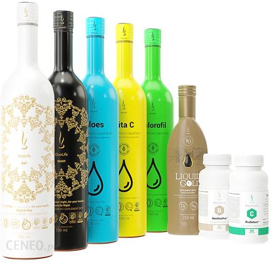 Pakiet ODPORNOŚĆ Rolą układu odpornościowego jest ochrona przed czynnikami zewnętrznymi. W układzie tym ogromne znaczenie ma przewód pokarmowy, który stanowi największy powierzchniowo narząd systemu immunologicznego, jednocześnie najbardziej narażony na kontakt z groźnymi czynnikami zewnętrznymi. Zachowanie prawidłowego przebiegu procesów odpornościowych jest zależne od uwarunkowań genetycznych, wieku, kondycji organizmu, stosowanej diety oraz czynników stresogennych. Wybrane produkty DuoLife dostępne w pakiecie Odporność, to krok w stronę wzmacniania systemu immunologicznego, poprzez dostarczanie organizmowi składników wspierających prawidłową pracę układu odpornościowego. Zegar biologiczny ODPORNOŚĆ: 8:00 – 25 ml DuoLife Dzień przed posiłkiem 8:30 – 2 kapsułki BorelissPro Medical Formula oraz 25 ml Vita C 10:00 – 25 ml Aloes DuoLife + 20 ml Chlorofil DuoLife 14:00 – 5 ml RegenOil Liquid Gold + 2 kapsułki ProSelect Medical Formula 19:00 – 25 ml DuoLife Noc przed posiłkiem Pakiet zawiera: 1szt – Vita C (750 ml), 1szt – Aloes (750 ml), 1szt – ProSelect (60 kapsułek), 1szt – BorelisPro (60 kapsułek), 1szt – Chlorofil (750 ml), 1szt – DuoLife Dzień i Noc (Dzień 750 ml + Noc 750 ml), 1szt – RegenOil LiquidGold (250 ml) Produkt należy zastosować przed spożyciem ostatniego posiłku. Godzina podana orientacyjnie. Rekomendowany czas suplementacji: 3 miesiące Jeden pakiet przy regularnym stosowaniu wystarcza na około 1 miesiąc, dla jednej osoby dorosłej.