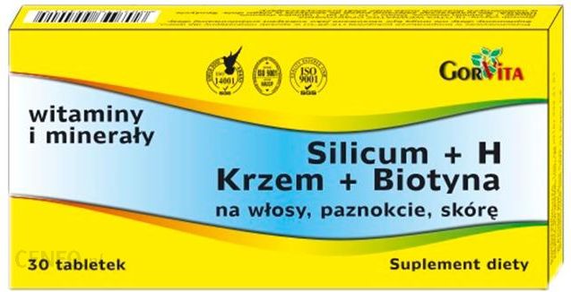 Suplement dietyPreparat jest źródłem krzemu i biotyny (witaminy H)Krzem bierze udział w tworzeniu komórek skóry właściwej, oraz regeneracji naskórka, stymuluje prawidłowe uwodnienie komórek skóry, co zapewnia jej zdrowy i młodzieńczy wygląd. Biotyna pomaga zachować zdrowe włosy i zdrową skórę. Pomaga w utrzymaniu prawidłowego stanu błon śluzowych. Przyczynia się do utrzymania prawidłowego metabolizmu energetycznego oraz do utrzymania prawidłowego metabolizmu makroskładników odżywczych. Ponadto pomaga w prawidłowym funkcjonowaniu układu nerwowego i utrzymaniu prawidłowych funkcji psychologicznych.Zastosowanie: suplementacja diety w składniki korzystnie wpływające na włosy, skórę i paznokcie.Zalecane spożycie: 1 tabletka dziennie. Tabletkę należy połknąć i popić wodą.Składniki: krzem (ditlenek krzemu), biotyna (D-biotyna); substancje dodatkowe: sorbitol E-420 (substancja wypełniająca), talk E-553b (substancja glazurująca), kwas jabłkowy E-296 (regulator kwasowości), aromat naturalny mięty pieprzowej.1 tabletka zawiera: krzem 15mg, biotyna 75mcg (150%)*.*RWS – Referencyjna Wartość SpożyciaWażne wskazówki:Nie należy przekraczać dziennej zalecanej porcji do spożycia.Zrównoważona i zróżnicowana dieta oraz zdrowy styl życia są podstawą zapewnienia prawidłowego funkcjonowania organizmu.Suplement diety nie może być stosowany jako substytut (zamiennik) zróżnicowanej diety.Przechowywać w temperaturze pokojowej (15-25°C), w sposób niedostępny dla małych dzieci.Spożycie w nadmiernych ilościach może mieć efekt przeczyszczający.Producent:PPUH Gorvita34 -607 Szczawa 106