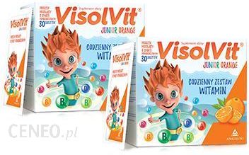 VISOLVIT JUNIOR Smak pomarańczowy Wskazania:Visolvit Junior smak pomarańczowy to suplement diety przeznaczony do codziennego stosowania przez dzieci powyżej 3. roku życia w stanach wzmożonego zapotrzebowania na witaminy np. w okresie powrotu do zdrowia po chorobach infekcyjnych, w osłabieniu organizmu, przy zwiększonym wysiłku fizycznym i umysłowym oraz w profilaktyce niedoboru witamin.Właściwości:Visolvit Junior smak pomarańczowy to zestaw witamin wspierających prawidłowy rozwój dzieci powyżej 3. roku życia. Zawiera on między innymi witaminy: D, A, C oraz witaminy z grupy B. Witamina A jest niezbędna w rozwoju układu nerwowego, w procesach widzenia, wzrostu kości i tworzenia szkliwa zębów. Witamina D3 jest odpowiedzialna za prawidłowy rozwój i mineralizację kości. Witaminy z grupy B, witamina C i kwas pantotenowy biorą udział w przemianach metabolicznych. Niacyna jest niezbędna do prawidłowego funkcjonowania mózgu, obwodowego układu nerwowego, do syntezy hormonów płciowych, hormonów tarczycy i insuliny. Produkt posiada smak pomarańczowy, co zachęca dziecko do regularnego przyjmowania witamin.Składniki:Składniki Visolvit Junior smak pomarańczowy: witamina A (palmitynian retynolu) 600 j.m.; witamina D(cholekalcyferol) 10 j.m.; witamina B1 (azotan tiaminy) 1 mg; witamina B2 (ryboflawina) 1 mg; witamina B6 (chlorowodorek, pirydoksyny) 1 mg; witamina B12 (cyjanokobalamina) 5 mikrogramów; witamina PP (nikotynamid) 10 mg; witamina C (kwas L-askorbowy) 100 mg; D-pantotenian wapnia 2 mg.Stosowanie:Visolvit Junior smak pomarańczowy w przypadku dzieci powyżej 3. roku życia zaleca się spożywać w ilości 1 saszetki dziennie. Zawartość saszetki należy rozpuścić w 1/2 szklanki letniej wody.Opakowanie:2 x 30 saszetek