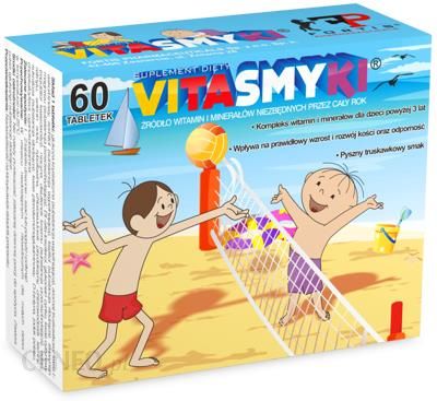 Vitasmyki to bogate źródło 11 witamin oraz 3 mikroelementów niezbędnych dla prawidłowego rozwoju. Dzięki tak dobranemu składowi preparat wspomaga prawidłowy rozwój i funkcje układu nerwowego (witaminy B1, B2, B3, B6, B12, kwas foliowy, jod, cynk), stymuluje naturalne mechanizmy obronne organizmu (witamina C, D3, B6, B12, selen, cynk), wspomaga widzenie (witamina A, B2, cynk), wspomaga prawidłowy wzrost i rozwój kości u dzieci (witamina D3) oraz ma korzystny wpływ na produkcję czerwonych krwinek (witamina B12, kwas foliowy).Zalecane spożycie1-2 tabletki dziennieOpakowanie60 tabletek