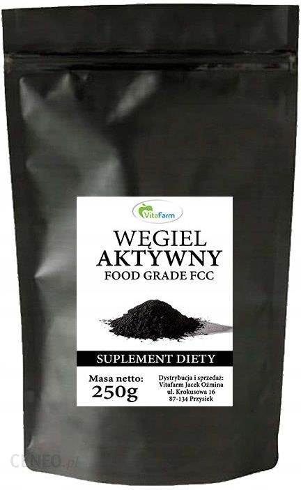WĘGIEL AKTYWNY DRZEWNY FCC SPOŻYWCZY 250 G PROSZEKWęgiel aktywny spożywczy – surowiec pochodzący ze spalania drewna w wysokiej temperaturze, poddawany działaniu pary wodnej lub kwasów, co czyni go „aktywnym”. Zwykle ma postać czarnego proszku lub grudek. Wykazuje silne właściwości wiążące i adsorpcyjne, a liczne pory powstałe w procesie aktywacji sprawiają, że posiada maksymalną powierzchnię wchłaniania. Cechy te powodują, że węgiel aktywowany świetnie wiąże toksyny, bakterie oraz wszelkie zanieczyszczenia.Właściwości:- wspomaga prawidłowe funkcjonowanie układu pokarmowego,- chroni błonę śluzową przewodu pokarmowego,- wiąże i usuwa bakterie oraz toksyny wywołujące biegunki,- łagodzi wzdęcia.Zastosowanie:200 mg (1 płaska łyżeczka, to 1500 mg produktu) rozpuścić w niewielkiej ilości wody i spożywać dwa razy dziennie, 30 minut po posiłku, 2 godziny przed lub po zażyciu leków.Zalecana porcja do spożycia w ciągu dnia to 400 mg. Nie należy przekraczać zalecanej porcji do spożycia w ciągu dnia. Suplement diety nie może być stosowany jako substytut zróżnicowanej diety.Należy pamiętać, że produkt może ograniczać wchłanianie się leków.Nie stosować przez długi okres oraz w przypadku chorób układu pokarmowego.Składniki:100% węgiel aktywny drzewny w proszku FCCPrzechowywanie:Przechowywać w suchym i zacienionym miejscu, w sposób niedostępny dla małych dzieci.Zachować ostrożność podczas otwierania opakowania